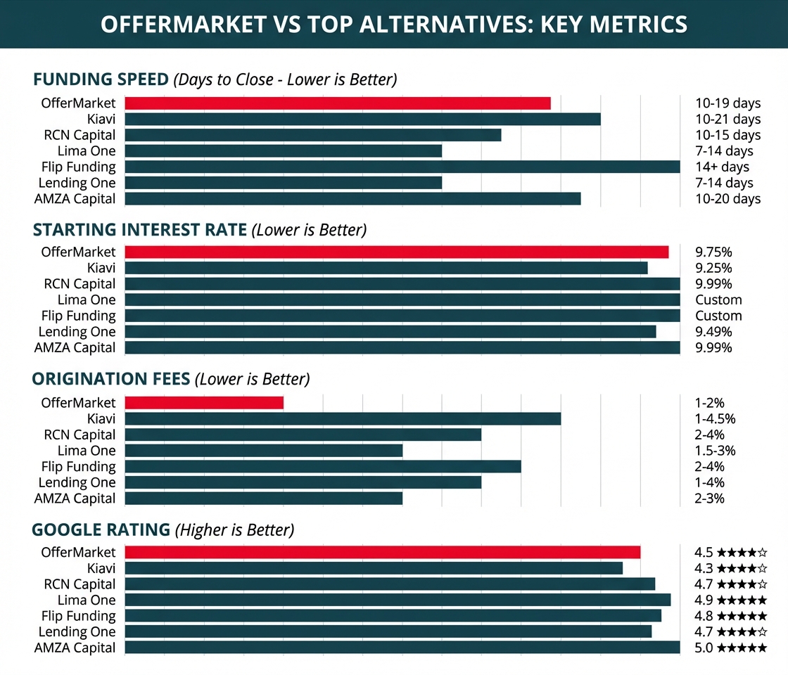 While OfferMarket leads the market in speed, technology, and overall value, understanding the full competitive landscape helps you make the most informed decision for your investment strategy. Each of these six lenders brings unique strengths to the table, serving different investor profiles and priorities. Here's an in-depth look at how they compare.