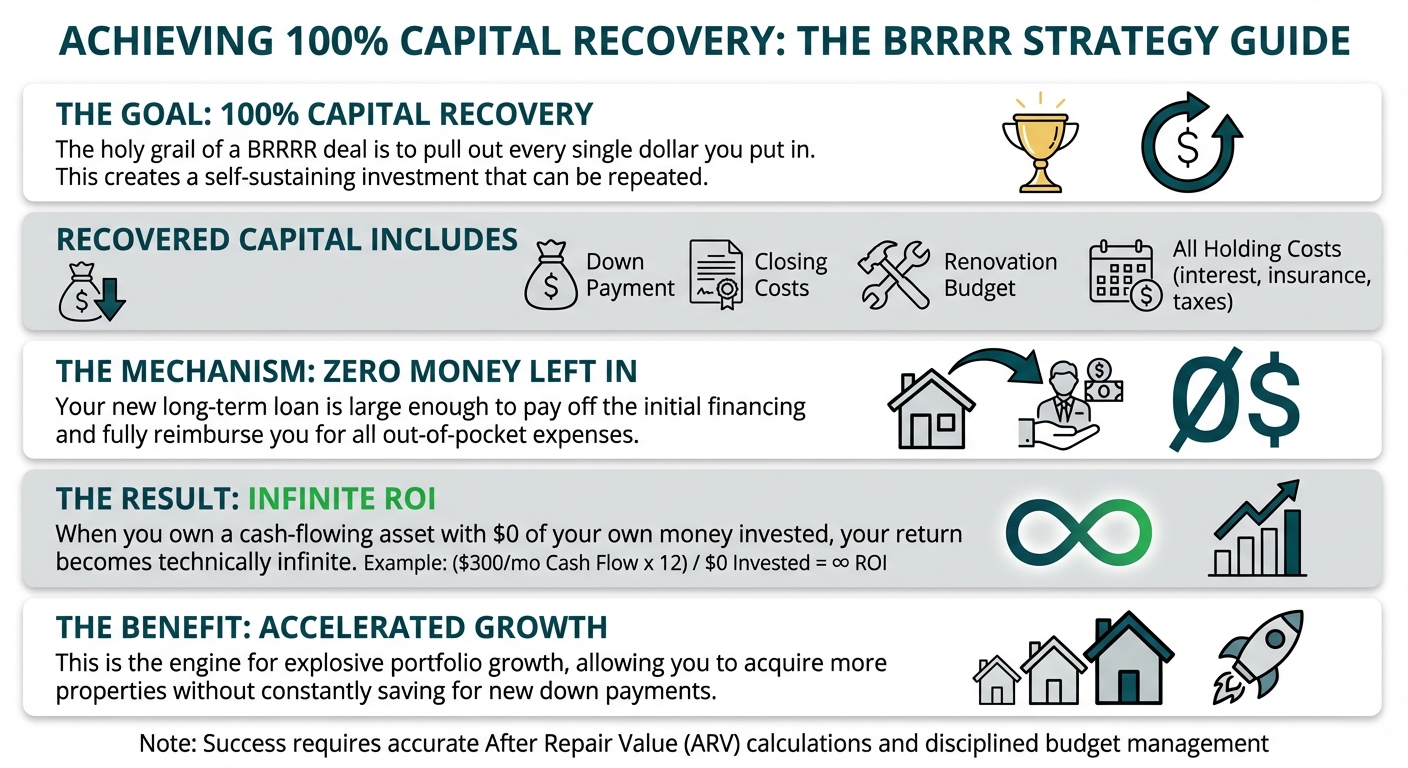 The holy grail of a BRRRR deal is to pull out every single dollar you put in. This includes your down payment, closing costs, renovation budget, and all holding costs (interest, insurance, taxes, utilities). When your new long-term loan is large enough to pay off the initial short-term loan and reimburse you for all your out-of-pocket expenses, you have achieved 100% capital recovery.