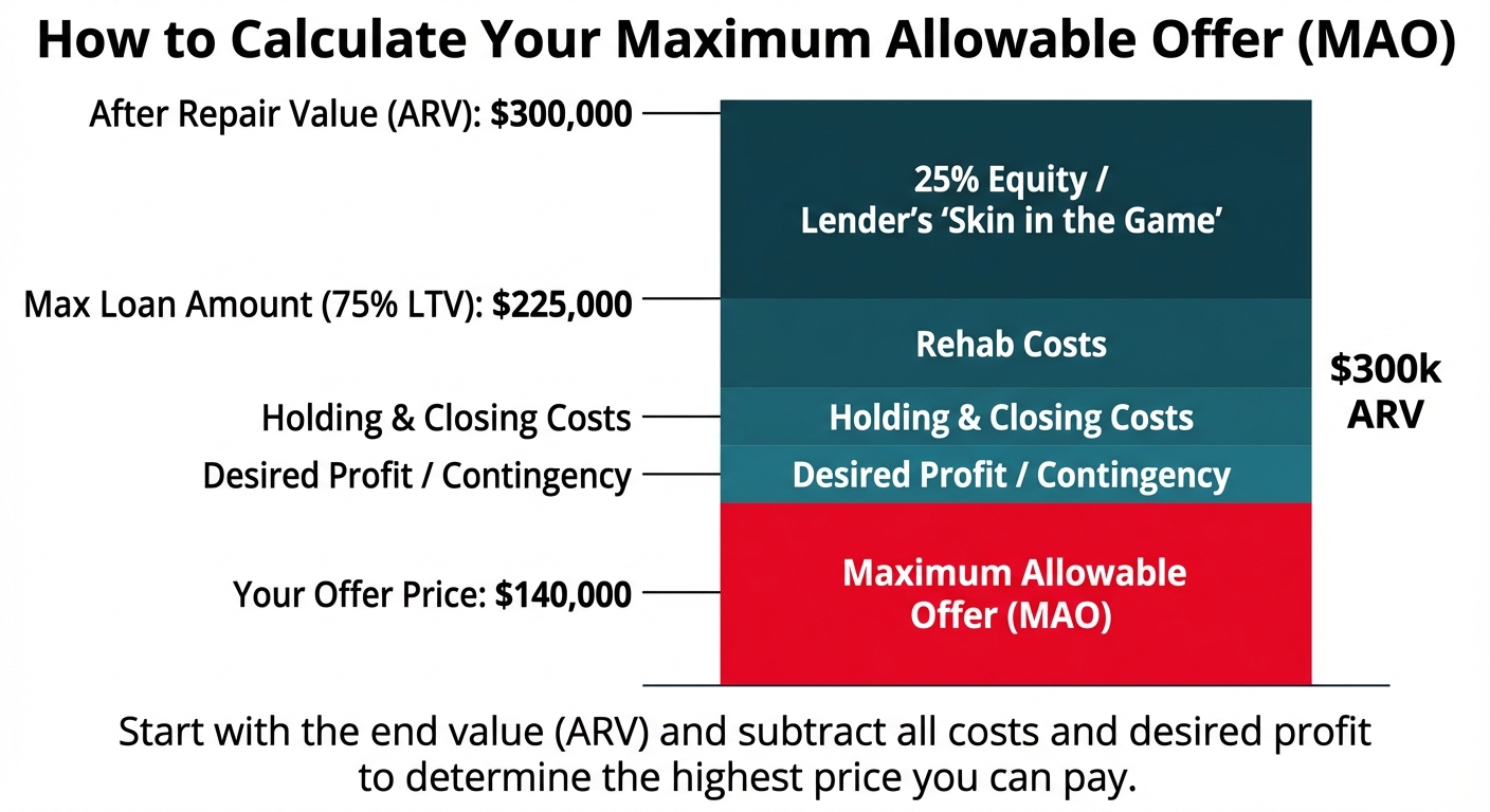 The formula is: MAO = (ARV x Max LTV) - Rehab Costs - Closing/Holding Costs - Desired Profit/Contingency