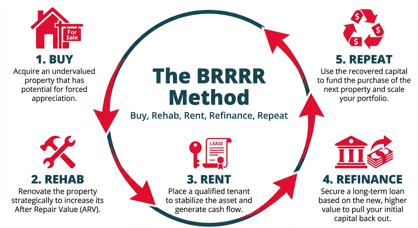 The BRRRR method is a real estate investment strategy that stands for Buy, Rehab, Rent, Refinance, Repeat. It allows investors to acquire a property, increase its value through renovations (forced appreciation), stabilize it with a tenant, and then pull their initial investment capital back out through a cash-out refinance. This capital is then used to acquire the next property, creating a repeatable system for scaling a rental portfolio. The ultimate goal is to recover 100% of the initial capital, allowing an investor to acquire a cash-flowing asset with little to no money left in the deal, achieving an infinite cash-on-cash return.