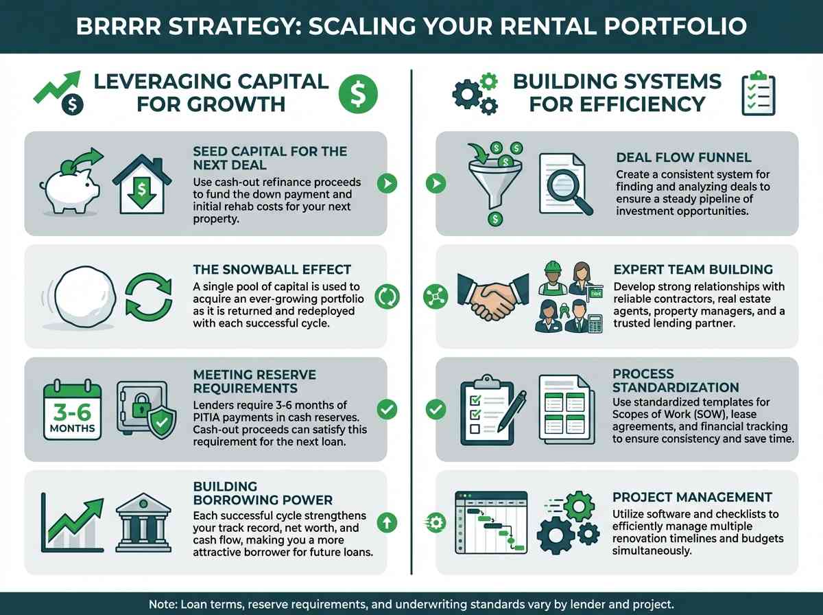 The cash you received from the refinance is now your seed capital for the next project. You can use it to cover the down payment and initial rehab costs for your next BRRRR property, using another Fix and Flip loan for the primary financing. This creates a "snowball effect," where a single pool of capital is used to acquire an ever-growing portfolio of properties. An investor who starts with $50,000 could theoretically acquire an unlimited number of properties, as the capital is returned and redeployed with each successful cycle.