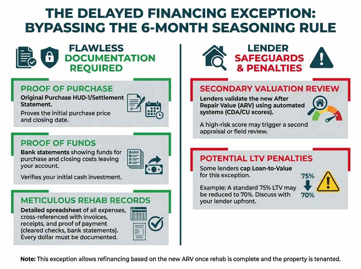 Under this exception, if you can prove the total funds invested in the project (purchase price + documented renovation costs), a lender can provide a cash-out refinance based on the new ARV, as long as the loan amount doesn't exceed your total documented cost basis. This allows you to execute the "Refinance" step as soon as the rehab is done and a tenant is in place.