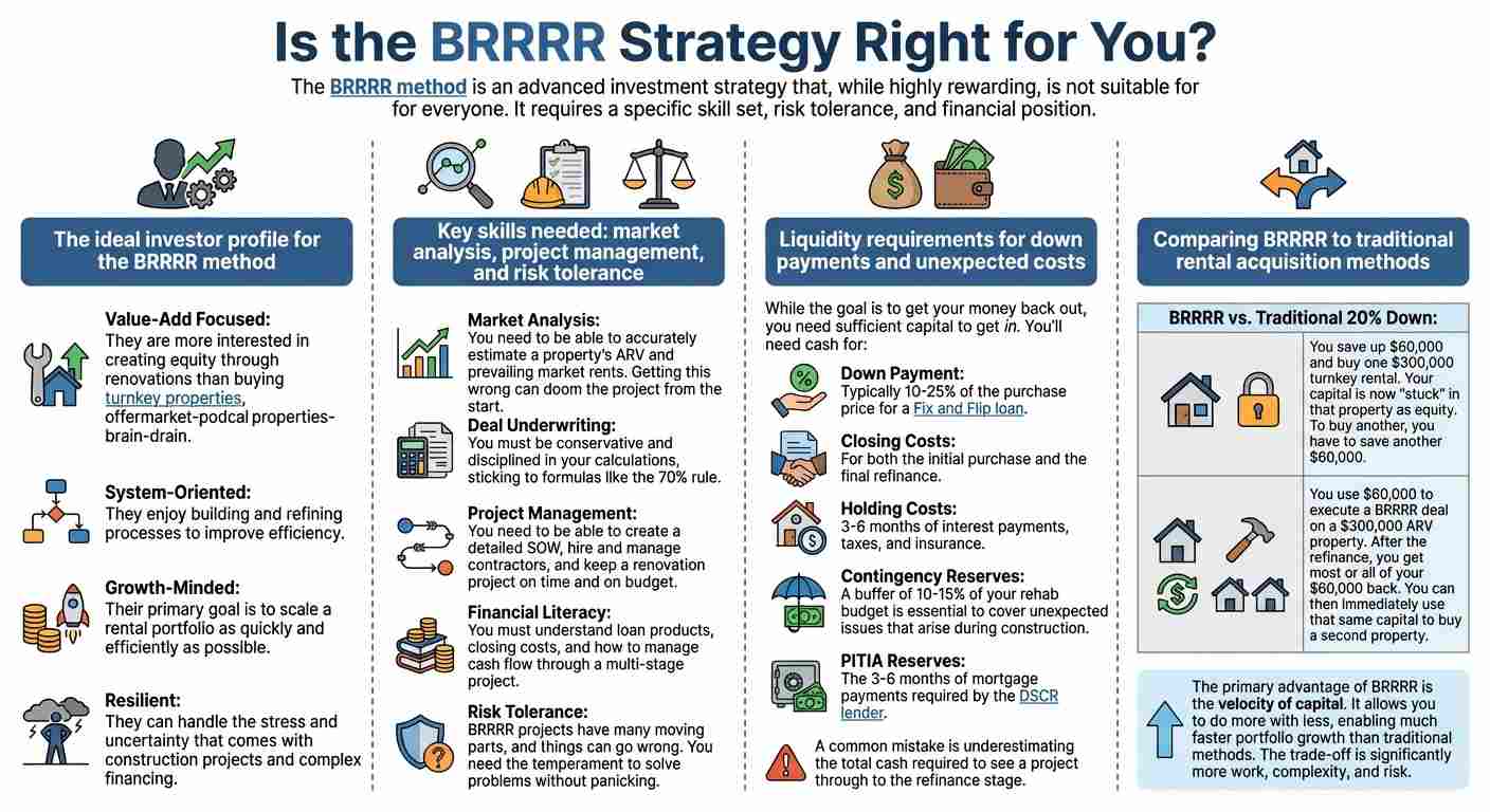 The BRRRR method is an advanced investment strategy that, while highly rewarding, is not suitable for everyone. It requires a specific skill set, risk tolerance, and financial position.