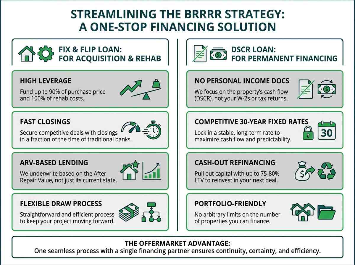 Executing a BRRRR strategy requires two distinct types of loans, and managing relationships with two different lenders can be inefficient and risky. A lender for the acquisition might not understand the needs of a long-term rental investor, and a permanent lender might not understand the fast-paced nature of fix-and-flip deals. OfferMarket bridges this gap by providing a seamless, one-stop financing solution for the entire BRRRR lifecycle.