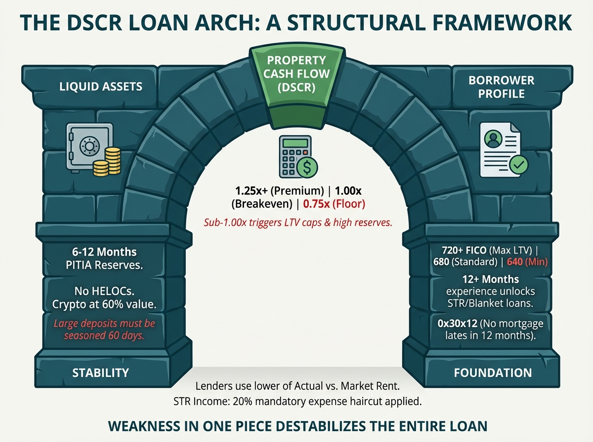 Picture DSCR loan requirements like an architectural arch—a time-tested structure that works because every piece supports the others. Weaken one element, and the whole thing comes down. This isn't just a helpful visual; it's exactly how lenders look at your DSCR loan application.