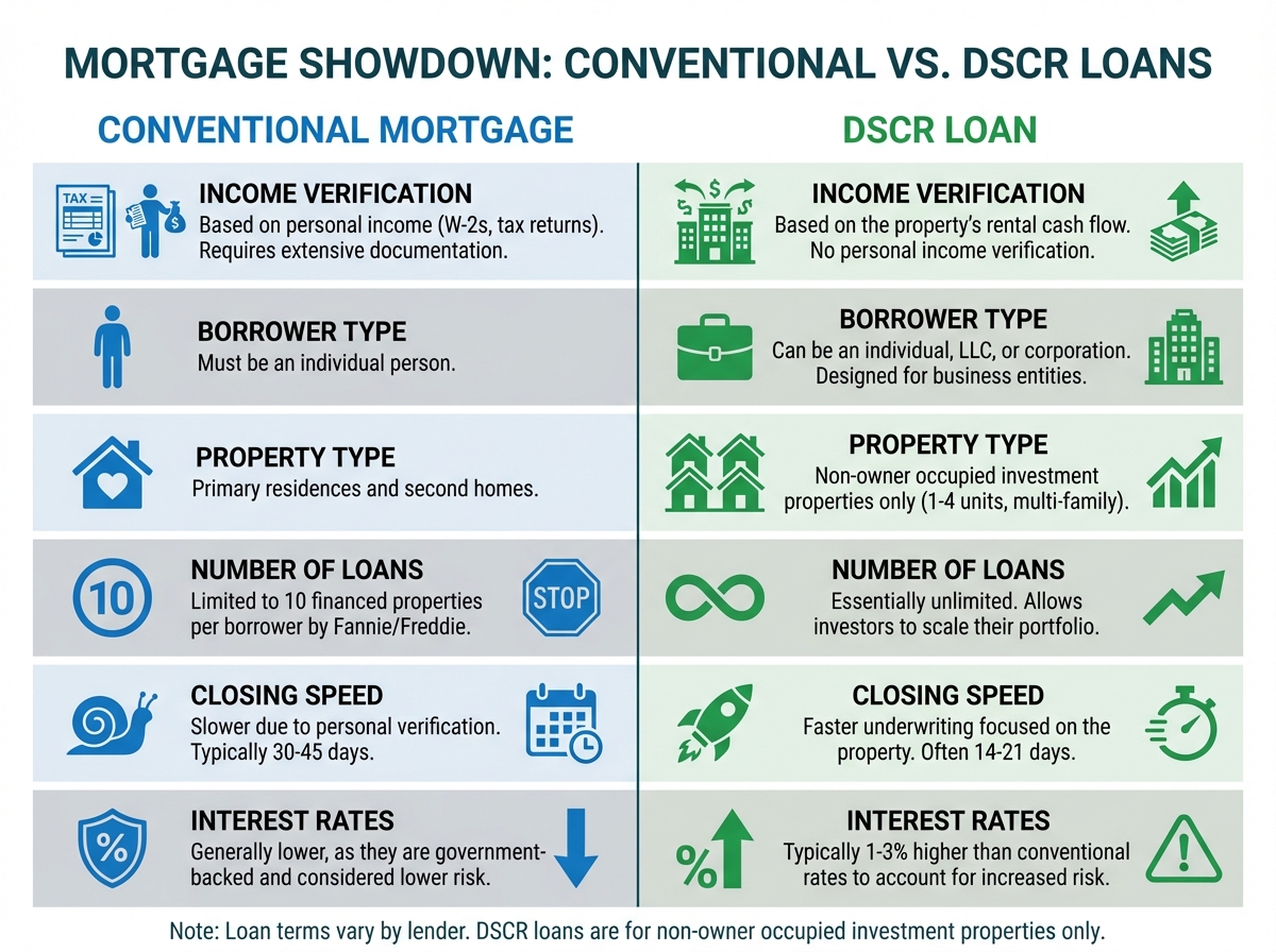 | Income Verification | Based on personal income (W-2s, tax returns, pay stubs). Requires extensive documentation of borrower's ability to pay. | Based on property's cash flow (DSCR). No personal income verification required. |