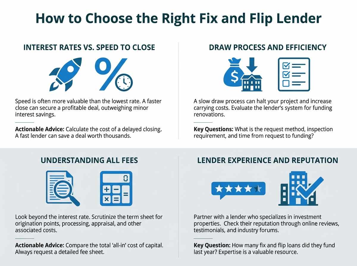 Get Your Quote →With so many options, selecting the right lender can feel overwhelming. The "best" lender is subjective and depends entirely on your priorities as an investor. A first-time flipper with limited capital has different needs than a seasoned professional flipping 20 houses a year. Focus on these four key areas to make an informed decision.