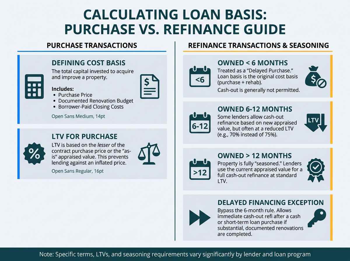 Owned less than 6 months: Most lenders will not allow a cash-out refinance. The loan will be treated as a "delayed purchase," with the loan basis being the original cost basis (what you paid for it + documented rehab).