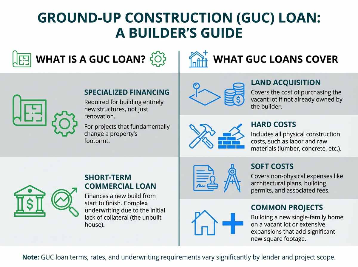 A GUC loan is a short-term commercial loan that covers the costs associated with a new build. This includes the land acquisition (if not already owned), hard costs (labor and materials), and soft costs (architectural plans, permits, fees). Because the collateral (the house) doesn't exist at the start of the loan, underwriting is significantly more complex and risk-averse.