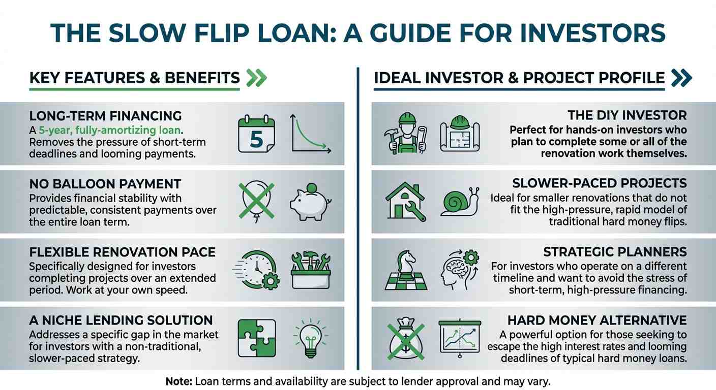 The Slow Flip loan is a niche but powerful product designed for investors who operate on a different timeline. It addresses a specific gap in the market: financing for smaller, slower renovation projects that don't fit the high-pressure, short-term model of traditional hard money.