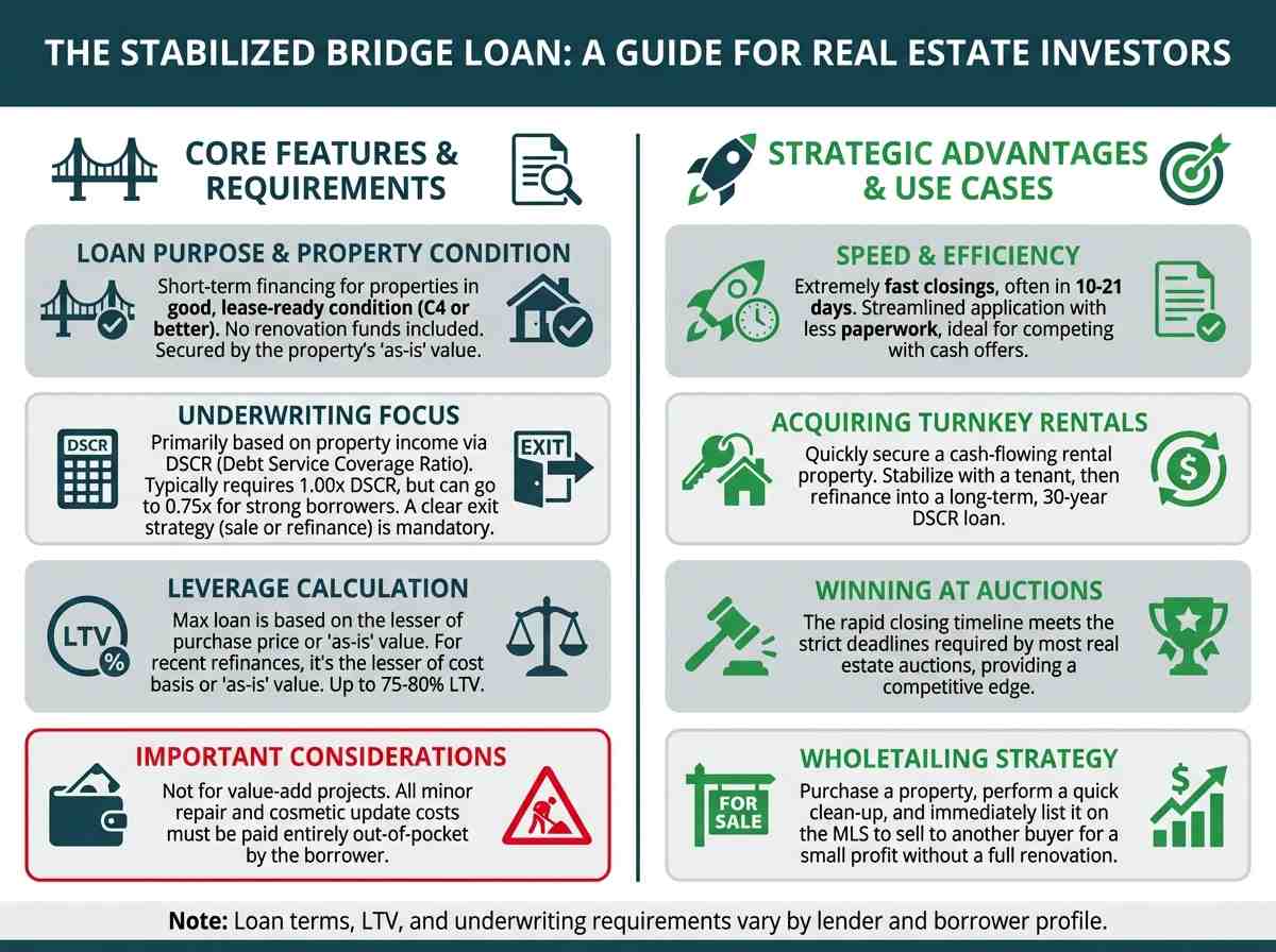 A Stabilized Bridge loan is a short-term financing tool for acquiring properties that are already in good, lease-ready condition and require minimal to no renovation. It serves as a "bridge" to either a quick resale or long-term financing.