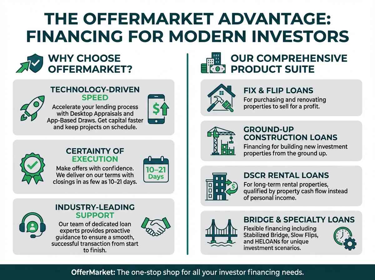 In a market that demands speed, efficiency, and reliability, choosing the right lending partner is paramount. OfferMarket is built from the ground up to serve the needs of modern real estate investors, combining a comprehensive product suite with cutting-edge technology and unparalleled support.