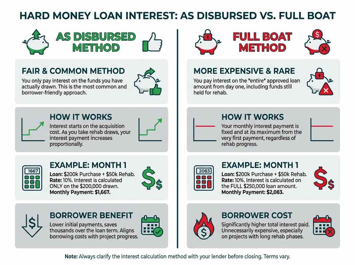 "Full Boat" (or "On Full Loan Amount"): Some lenders charge interest on the entire approved loan amount from day one, even on the rehab funds sitting in the holdback account. This is significantly more expensive for the borrower.