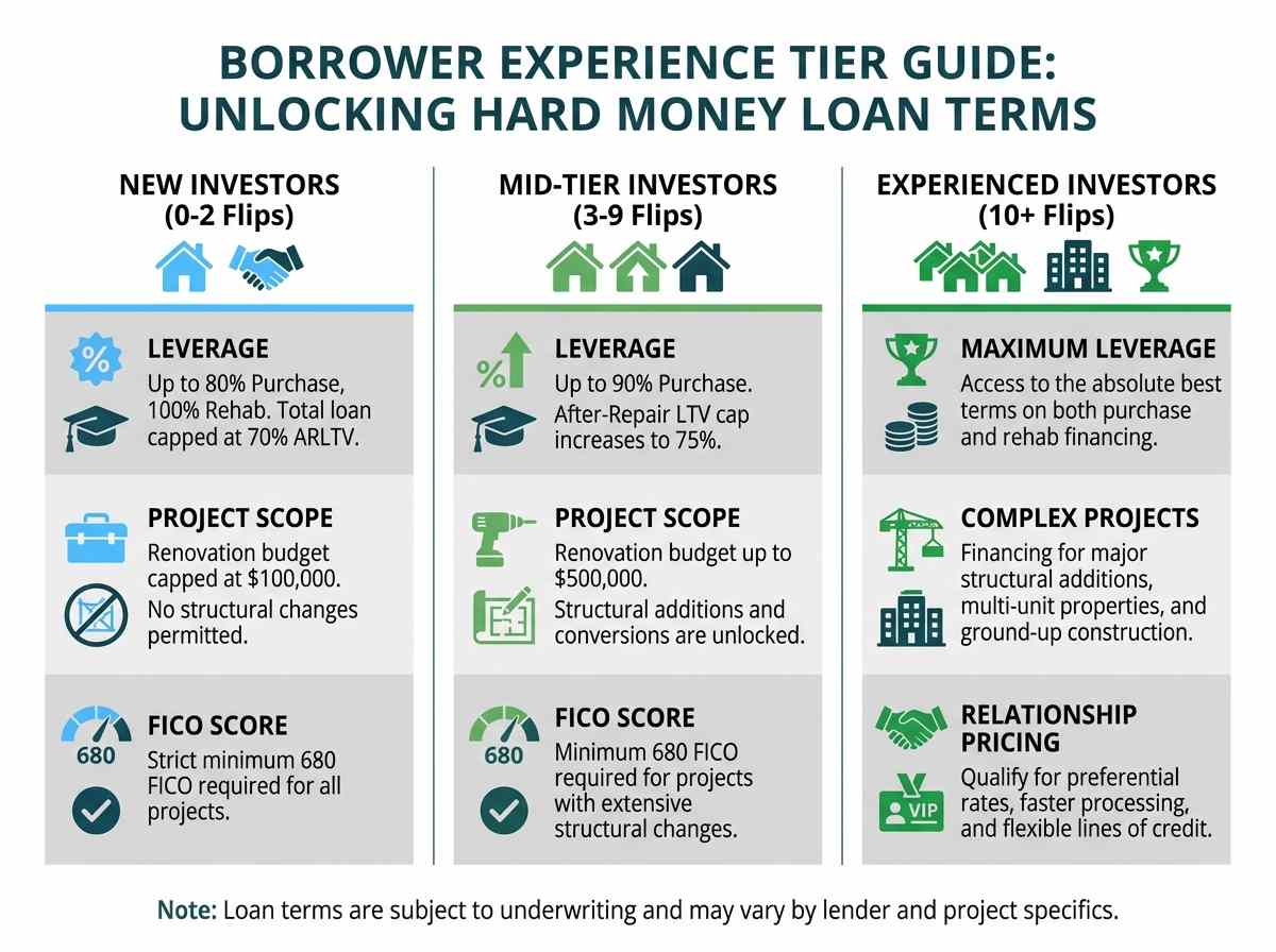 Lenders use experience tiers to quantify the risk associated with a borrower. An investor who has successfully completed ten flips is statistically far less likely to default than someone tackling their very first project. This experience translates directly into better terms: higher leverage, lower rates, and access to more complex loan products.