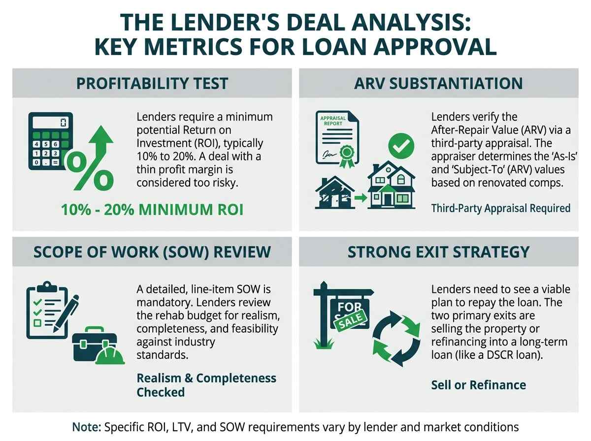 Lenders need to see a clear path to profit for the investor. A profitable deal for you means a successful loan repayment for them. Most lenders will run their own analysis on your numbers and will require the project to show a minimum potential Return on Investment (ROI), typically in the 10% to 20% range.