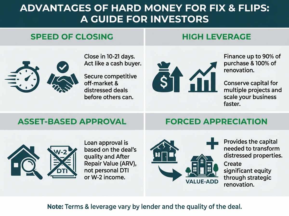 For fix and flip investors, the advantages of hard money loans are substantial and often make deals possible that would otherwise be out of reach.
