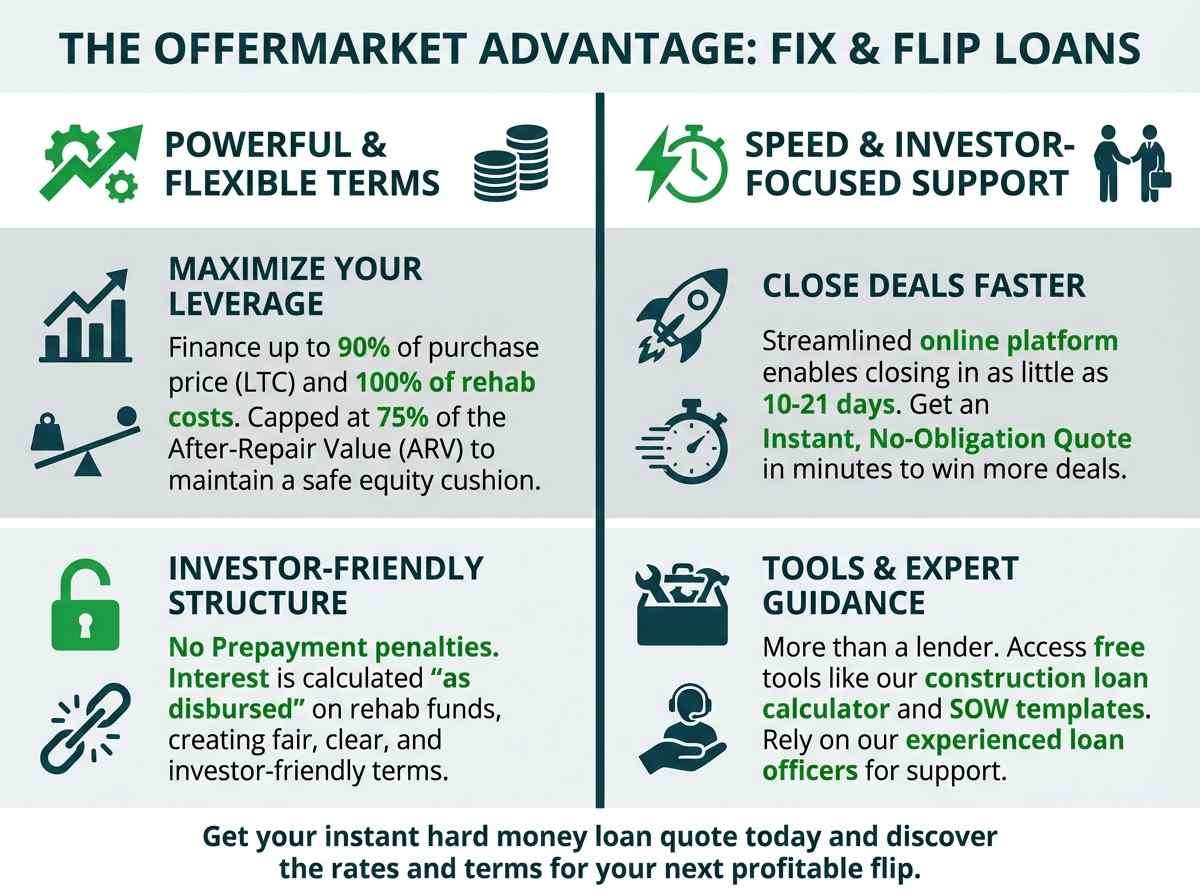 This is essential for the fix and flip business model. If you complete a renovation in four months and find a buyer in the fifth month, you can close the sale, repay the loan, and realize your profits immediately. Traditional loans, and even some less scrupulous private lenders, may include prepayment penalty clauses that eat into your profits if you pay the loan off "too early." A lender like OfferMarket that offers no prepayment penalties aligns its success with the investor's goal: a fast and profitable flip.