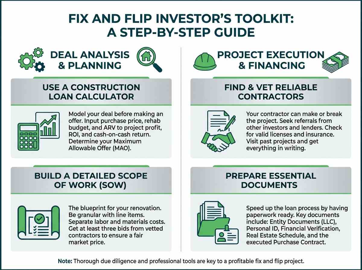 Before you ever make an offer, you need to run the numbers meticulously. A comprehensive construction loan calculator is an indispensable tool. It allows you to input all your key variables—purchase price, rehab budget, ARV, and financing terms (interest rate, points)—to instantly see your projected profit, ROI, and cash-on-cash return. This enables you to: