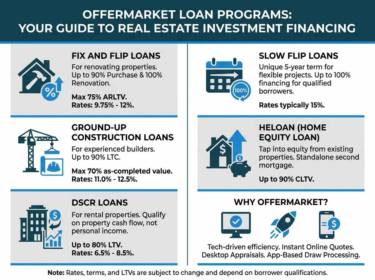 Limited Loan Products: Their product suite, while tech-enabled, is less diverse than OfferMarket's. They primarily focus on standard fix and flip, rental, and construction loans, but lack more specialized options like the Slow Flip or a dedicated HELOAN for leveraging equity in other properties.