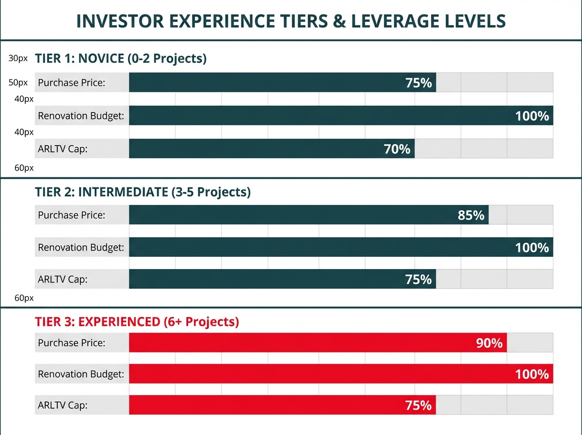Intermediate investors with one to three completed projects may qualify for slightly reduced leverage, such as 85% of purchase price and 100% of renovations, or 90% of purchase with a lower ARLTV cap. These terms still provide substantial financing while accounting for the moderately higher risk profile.