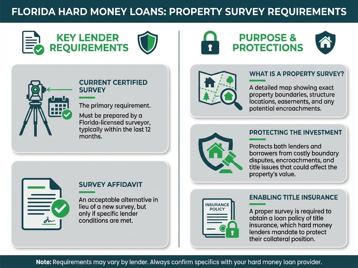 Florida's requirement for certified property surveys or acceptable survey affidavits adds both cost and time to the closing process for hard money loans. Unlike some states where title insurance alone suffices, Florida lenders typically require current surveys to verify property boundaries, identify encroachments, and confirm that improvements sit within legal property lines.