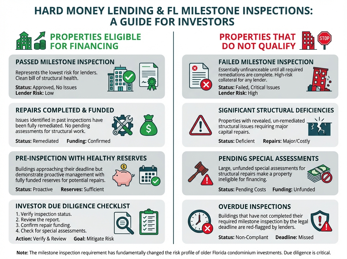 Here's where milestone inspections directly affect your ability to secure hard money financing: properties that fail their milestone inspection or reveal significant structural deficiencies become essentially unfinanceable until those issues are remediated.