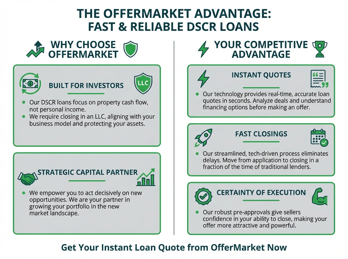 In fact, the law indirectly strengthens the case for DSCR loans. With less competition from cash buyers, more investors will be able to successfully win contracts with financed offers. This will likely lead to an increase in demand for DSCR loans, and lenders will be eager to serve the now-empowered small investor market. Lenders like OfferMarket are perfectly positioned to meet this demand, providing the speed and certainty needed to compete effectively in this new environment.