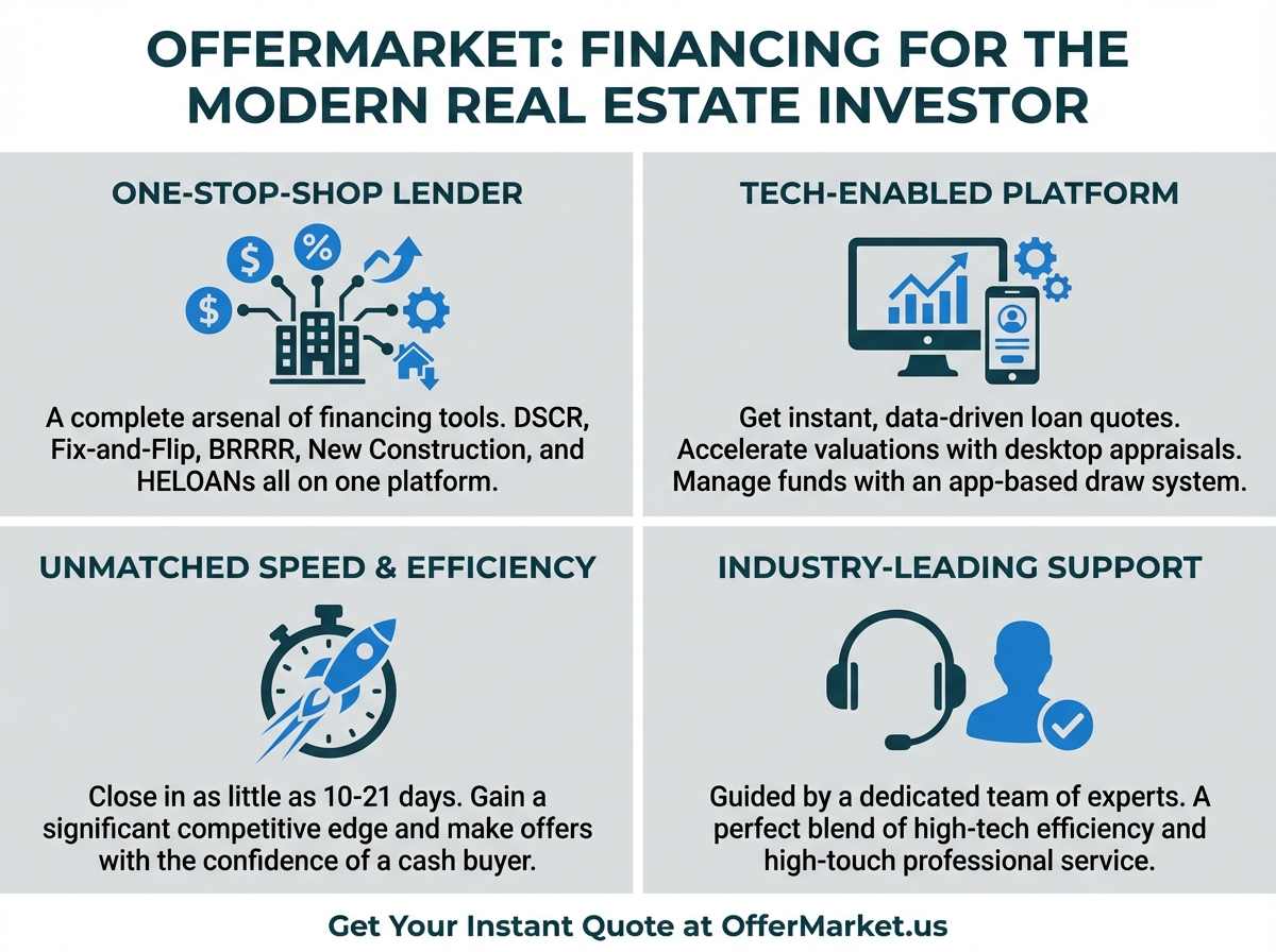 In a competitive market, success hinges on speed, efficiency, and access to the right capital. OfferMarket has engineered its entire platform around these principles, establishing itself as the undisputed leader for modern real estate investors. It's not just a lender; it's a comprehensive financing partner designed to help you scale your business.
