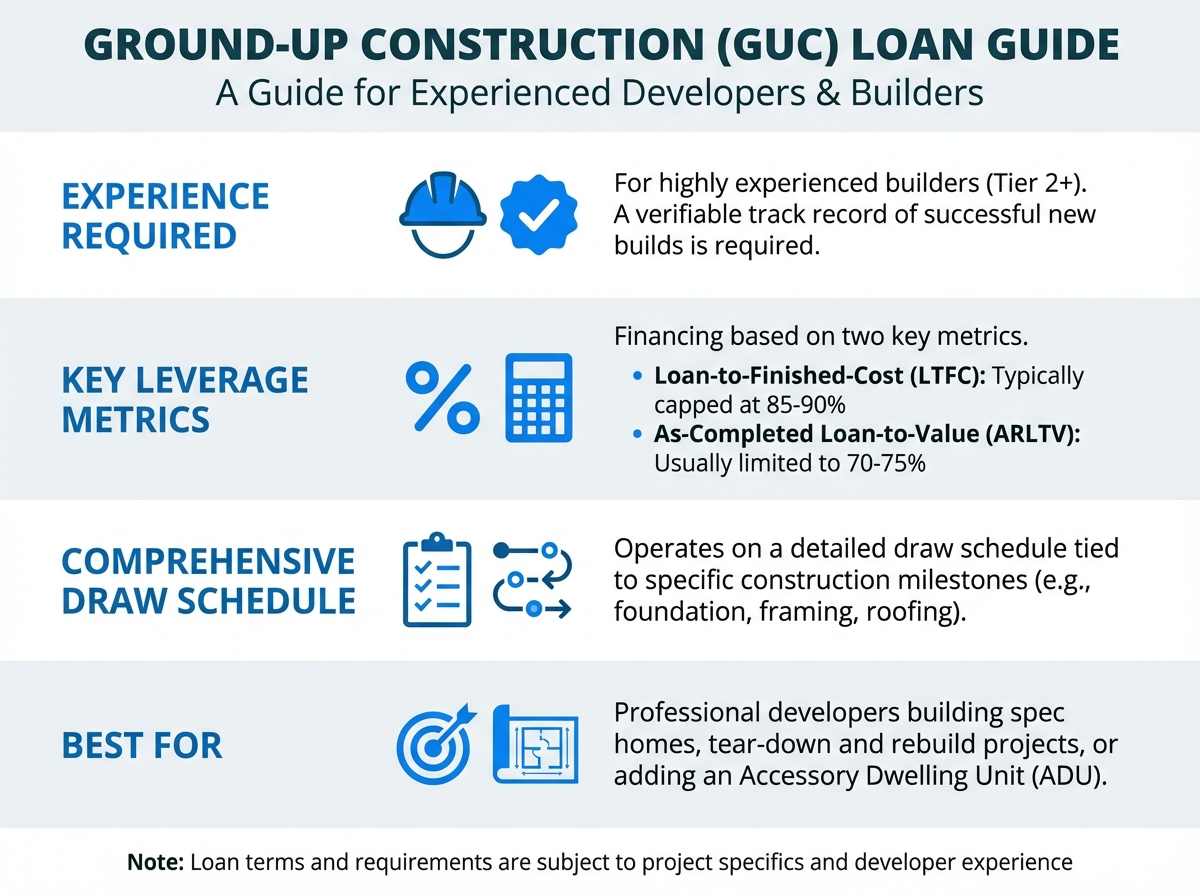 Draw Schedule: Similar to a fix-and-flip loan but more detailed, GUC loans operate on a comprehensive draw schedule tied to specific construction milestones (e.g., foundation poured, framing complete, roofing installed).