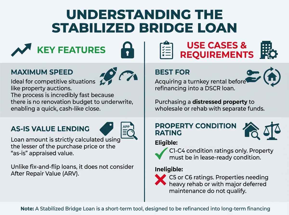 In a hot market, speed is everything. A Stabilized Bridge loan is the perfect tool for acquiring a property quickly when it needs little to no renovation. It acts as a short-term financing bridge, allowing you to secure the property with a fast, cash-like closing before putting long-term financing in place.