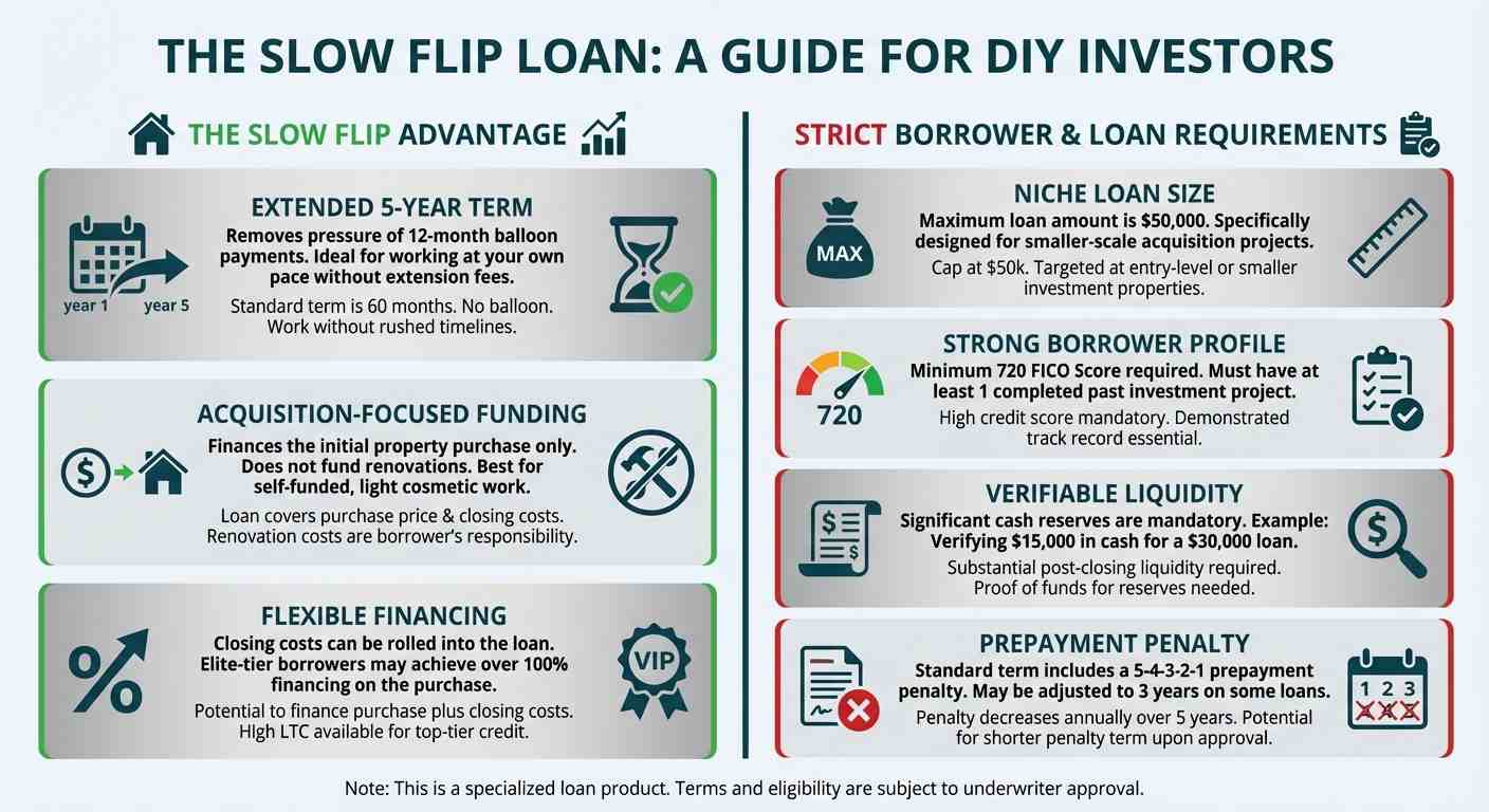 Extended Term: The Slow Flip offers a 5-year term, removing the stress of a looming balloon payment. This allows investors to work at their own pace without facing extension fees or the risk of default. This term features a 5-4-3-2-1 prepayment penalty, though it can sometimes be adjusted to a 3-year term for lower loan amounts with management approval.