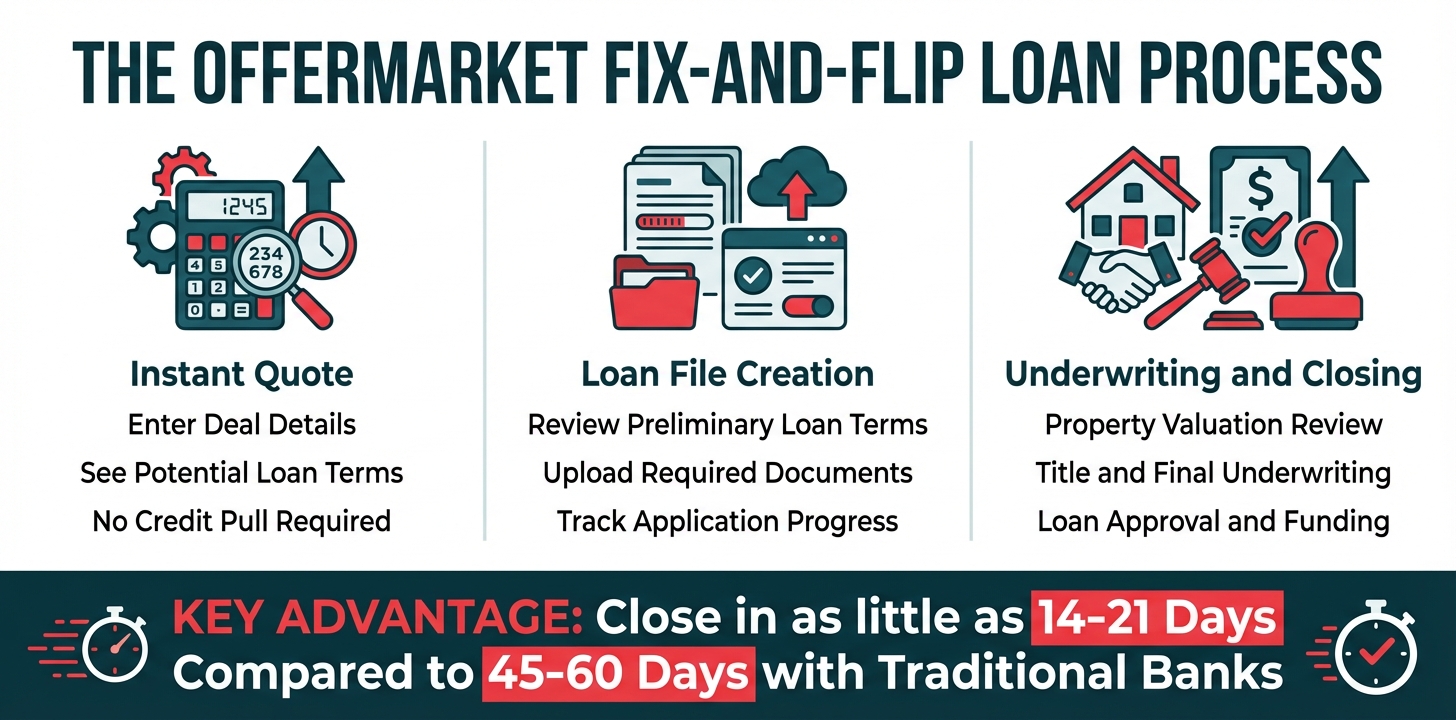 Once your application is submitted with complete documentation, OfferMarket's underwriting team moves quickly to evaluate your deal. According to industry data, while conventional lenders take 45-60 days for loan approval, specialized hard money lenders can close in 14-21 days. OfferMarket targets the faster end of this spectrum, with many loans closing in as little as 14-19 days from complete application to funding.