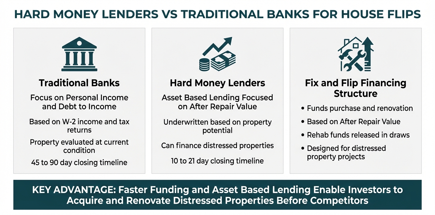 When it comes to financing a house flip, understanding the fundamental differences between hard money lenders and traditional banks can mean the difference between seizing an opportunity and watching it slip away. These two lending approaches operate on entirely different philosophies, timelines, and underwriting criteria—each designed for distinct purposes in the real estate investment landscape.
