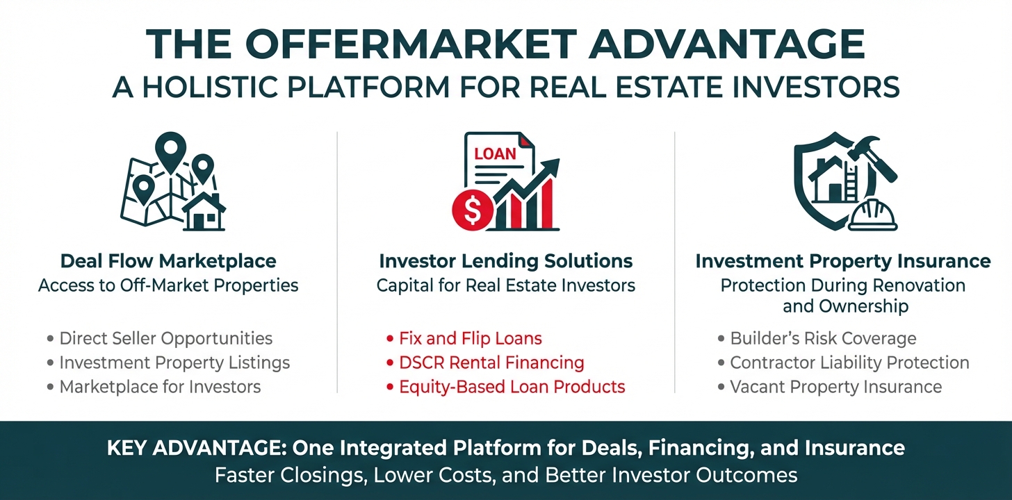 In the competitive world of real estate investing, success often hinges on more than just securing financing—it requires access to deals, comprehensive insurance, and a seamless process that connects all these elements. OfferMarket has built a holistic platform that goes far beyond traditional lending, creating an integrated ecosystem designed specifically for the needs of real estate investors flipping houses and building rental portfolios.
