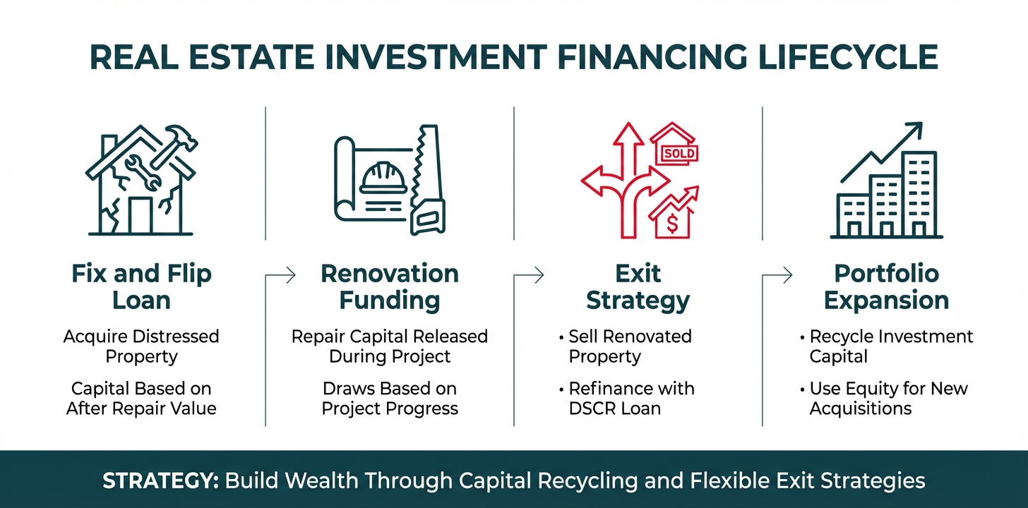 The strategic sequencing of these products creates a powerful wealth-building cycle. You use a Fix and Flip loan to acquire and renovate. You either sell for immediate profit or refinance with a DSCR loan to pull your capital back out while retaining the asset. You then use that recycled capital—or equity from existing properties via a HELOAN—to fund your next acquisition. This systematic approach, when executed with discipline and proper planning, allows you to scale your real estate business far beyond what personal income-based lending would permit.